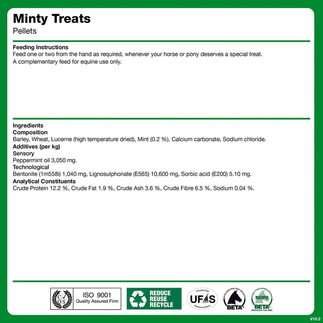 NAF Minty Treats are formulated using only the best quality ingredients, including real peppermint, so that you can now offer your horse a healthy and delicious treat. They are highly palatable and smell delicious to appeal to both you and your horse. NAF Minty Treats are ideal to feed everyday, or just now and again as a reward, as a training aid or simply to let him know how much you love him.